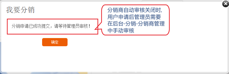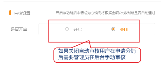 1.如果关闭自动审核功能,用户在申请后需在在分销商管理中手动审核。