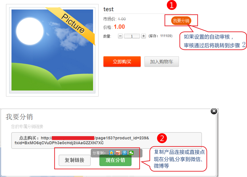 3.3.点击我要分销,审核通过后可以复制链接通过邮件等方式分销,或直接点击现在分销,将产品推送到您的微信-》微博
