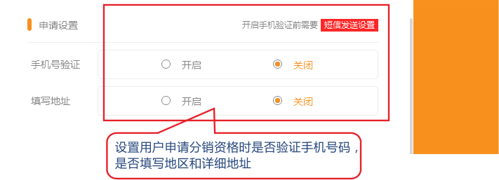 3.分销申请设置,此处可以设置用户在申请分销商资格时是否验证手机号码,是否填写地区和详细地址